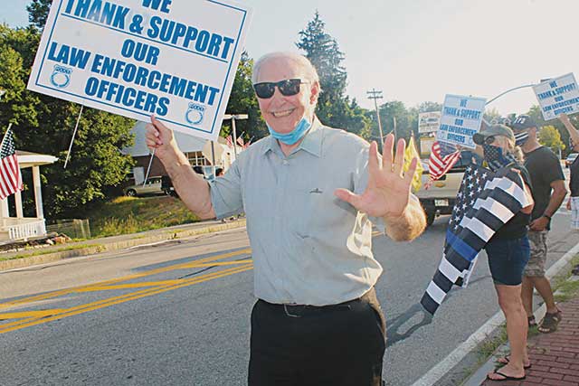 JERRY VENEZIA, a retired state trooper and a practicing attorney, waves to passersby on Park Street during the Support the Blue rally. (Maureen Doherty Photo)