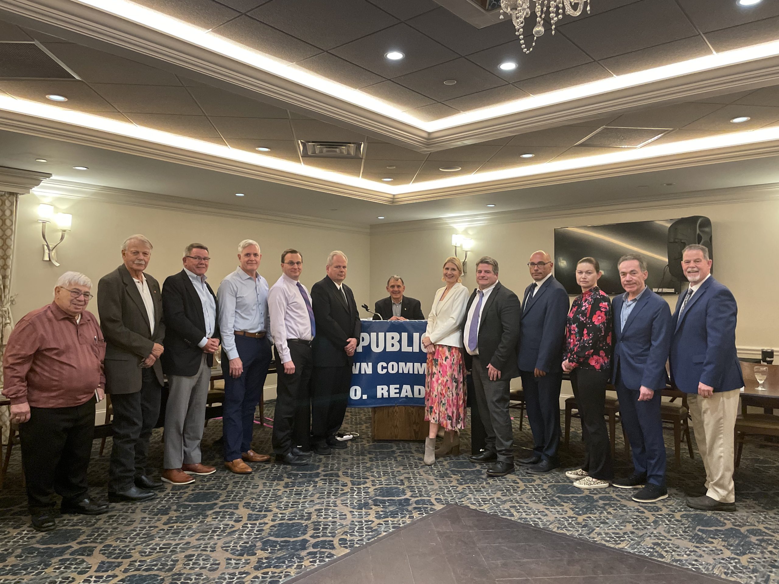 ALL 12 CANDIDATES in the annual Town Election on May 6 participated in a spirited forum Tuesday night at Kitty’s hosted by the North Reading Republican Town Committee. Over 90 people attended and asked the candidates pointed questions as the town faces steep budget deficits in FY26 and beyond. From left: Chuck Carucci (Housing Authority), Warren Pearce (CPC 3-year), John Murphy (Town Moderator), Dave Rudloff (CPC 3-year), Jon Coste and Ed Sheehan (CPC 2-year), NRRTC Chair Jeff Yull, Noelle Rudloff and Jeff Friedman (School Com), and Select Board candidates Mike Scarlata, Catherine Morrin, Rich Wallner and Jeff Griffin. (Maureen Doherty Photo)