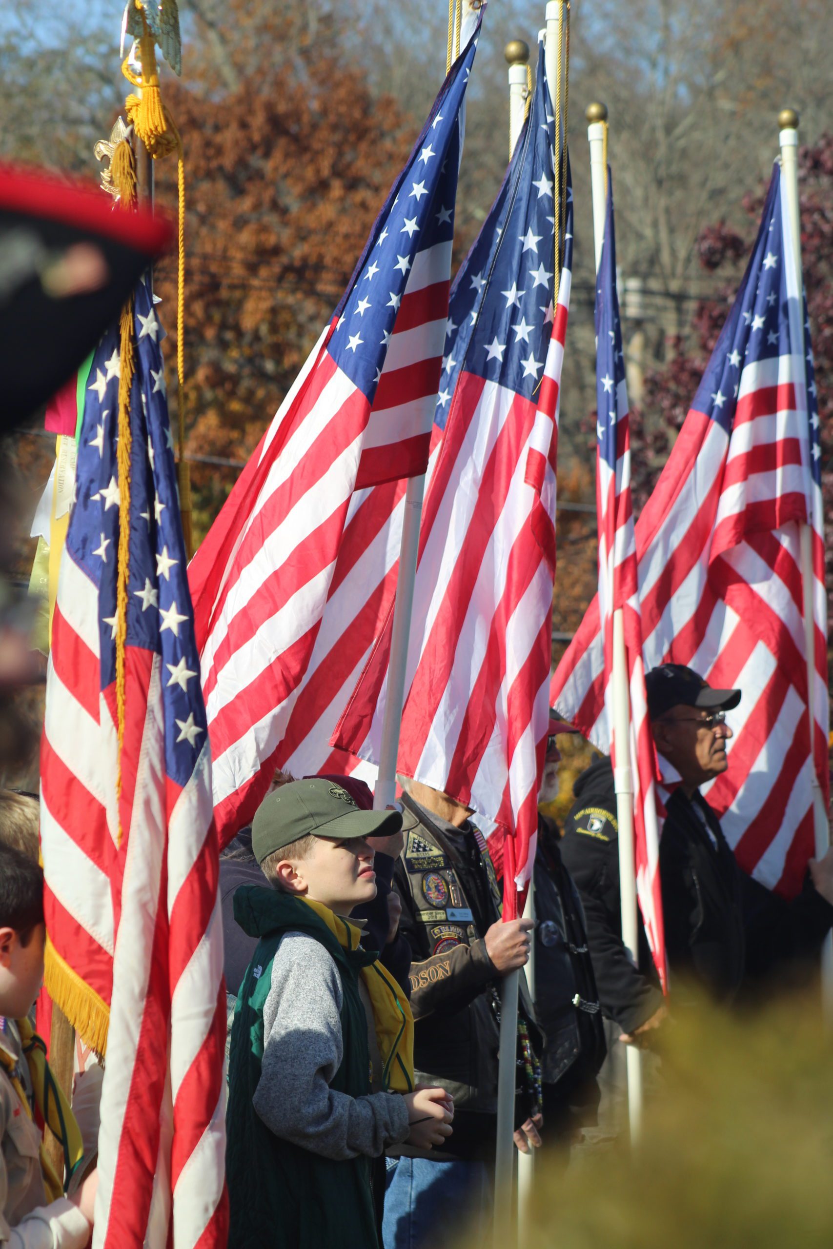 A BOY SCOUT from Troop 750 is enveloped by the American flag display formed by the Patriot Guard Riders who stood at the top of the common throughout the town’s Veterans Day ceremony. (Maureen Doherty Photo)