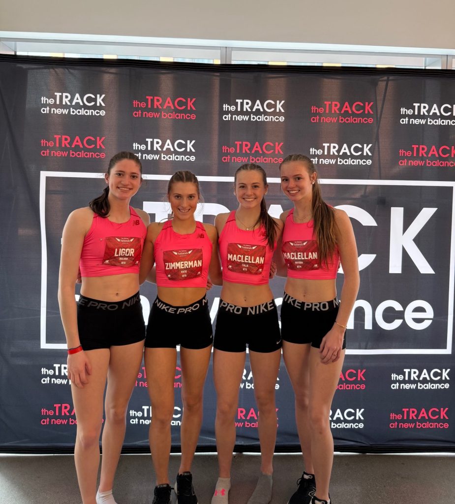 Giuliana and Callie teamed up with Hayden MacLellan and Katie Zimmerman 48 hours later and competed in the 4×55 Meter Shuttle Hurdles. The relay team had an impressive performance running the race in 34.48 seconds which smashed the previous North Reading record by over two seconds and placed 7th overall, just missing the podium as All Americans, which is reserved for the top six teams.