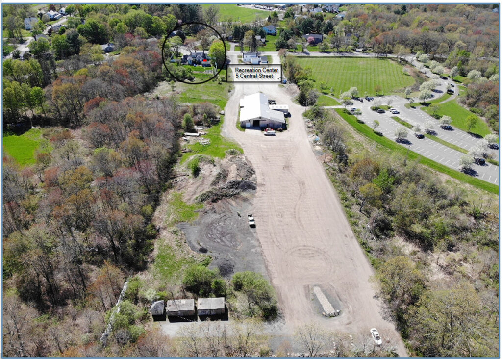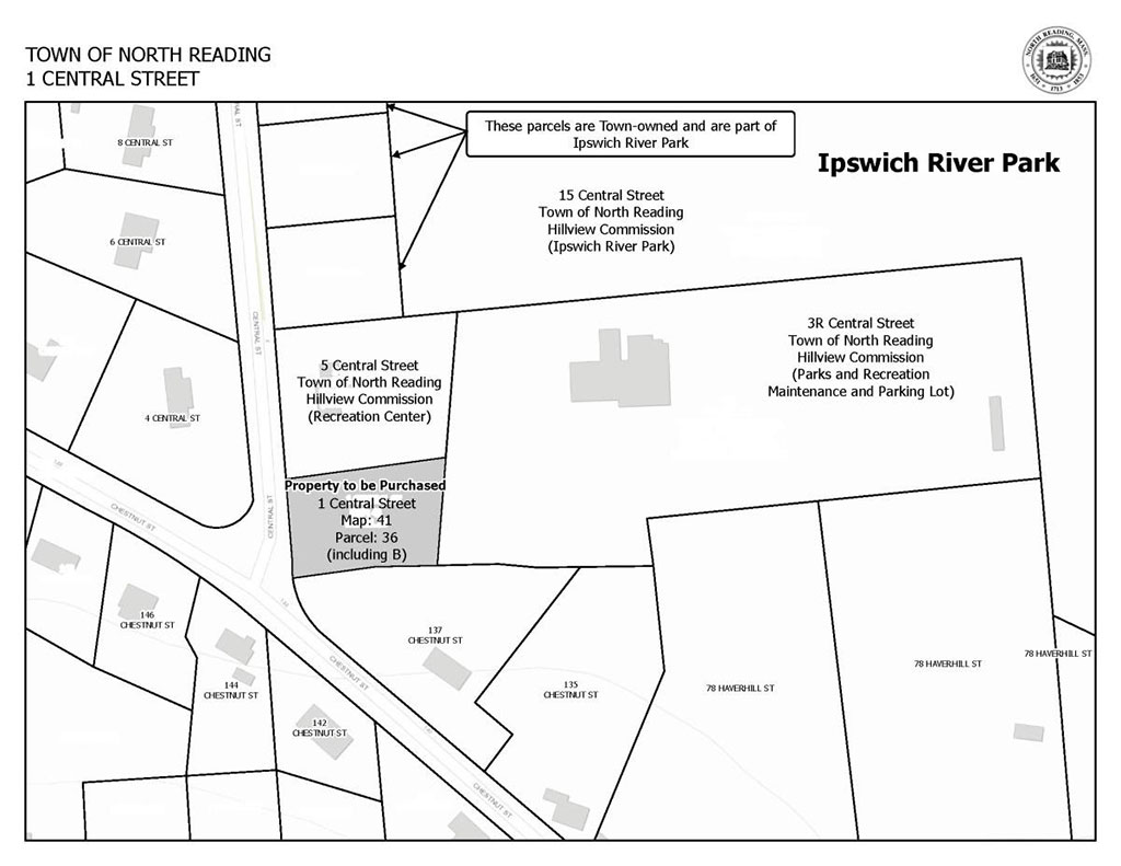 The town already owns property on two sides of 1 Central Street – 5 Central Street, which is the small house lot presently used as a Recreation Center annex and that previously served as a temporary location of the town’s police headquarters during the renovation of the police station — and 3R Central Street, which was originally part of the Wheeler homestead and includes the Wheeler barn currently used as a large maintenance shed for Parks & Recreation plus the surrounding large the dirt parking lot currently used as overflow parking for Ipswich River Park and parking for the town’s school buses.