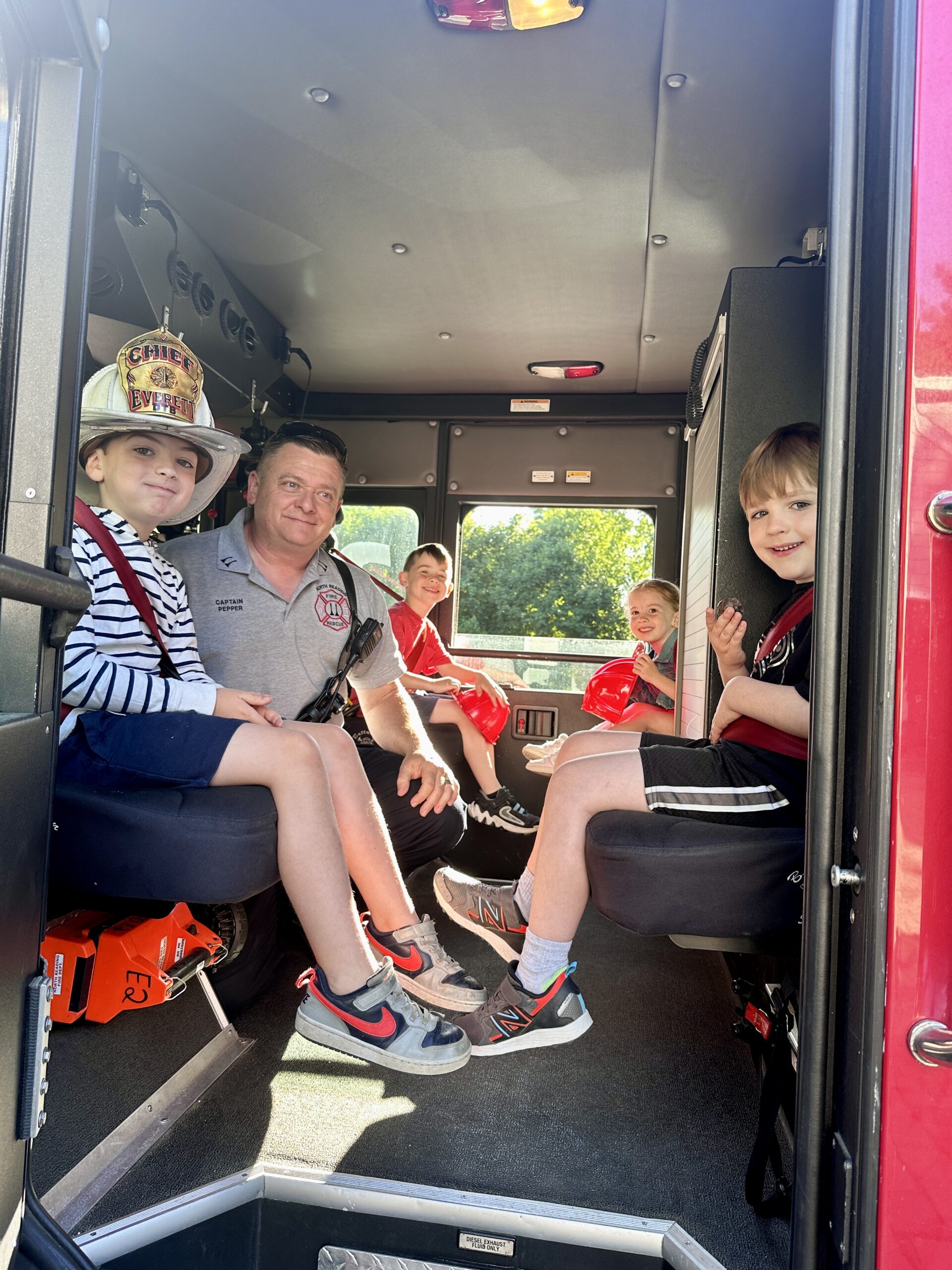 KINDERGARTENER Patrick Frew, at left, was excited to ride a big red fire truck to school driven by Fire Capt. Eric Pepper. He shared the fun with three of his friends (clockwise from left): Connor Balsley (Batchelder), Ella Balsley (Hilltop), and Daniel Wittenbach (Little). Patrick is the grandson of retired Everett Fire Chief David Butler and proudly wore his grandfather’s helmet during his ride aboard Engine 2. His parents submitted the winning bid at the Little School’s Casino Royale Silent Auction earlier this year to win the ride and support extracurricular activities at his school. (Courtesy Photo)