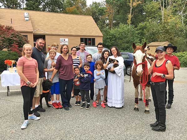 THE BLESSING of the Pets at Aldersgate United Methodist Church, held Sunday, Oct. 7, attracted all creatures, great and small. Pictured from left are: Savanna, Chuck, Logan, Skylar and Danielle Helm with their bearded dragon, Rocky, and puppy, Sophie; Michelle, Trevor, Ian and Trevor Mullet with guinea pigs, Flash and Mittens; Calvin, Eva, Wesley, Lucy and Pastor Rachel Fisher with their kitty, Hermione; and Laine Raia and Cowboy Ed with their quarterhorse Apache and Siamese cat, Cairo, who is almost 20 years old, riding on Apache’s back. (Courtesy Photo)
