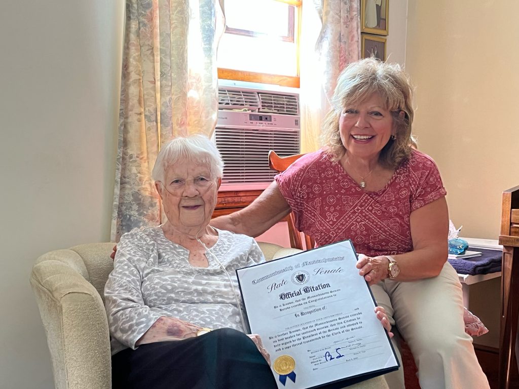 ETHEL MILLEY recently celebrated her 100th birthday! She has enjoyed living in her North Reading home since 1952. Born on June 5, 1925, she was surprised and excited to be honored with a Senate citation marking the occasion during a recent visit from Mary Ann Nay (right), Senior District Director for state Sen. Bruce E. Tarr. Ethel enjoyed celebrating her special birthday with family. (Courtesy Photo)