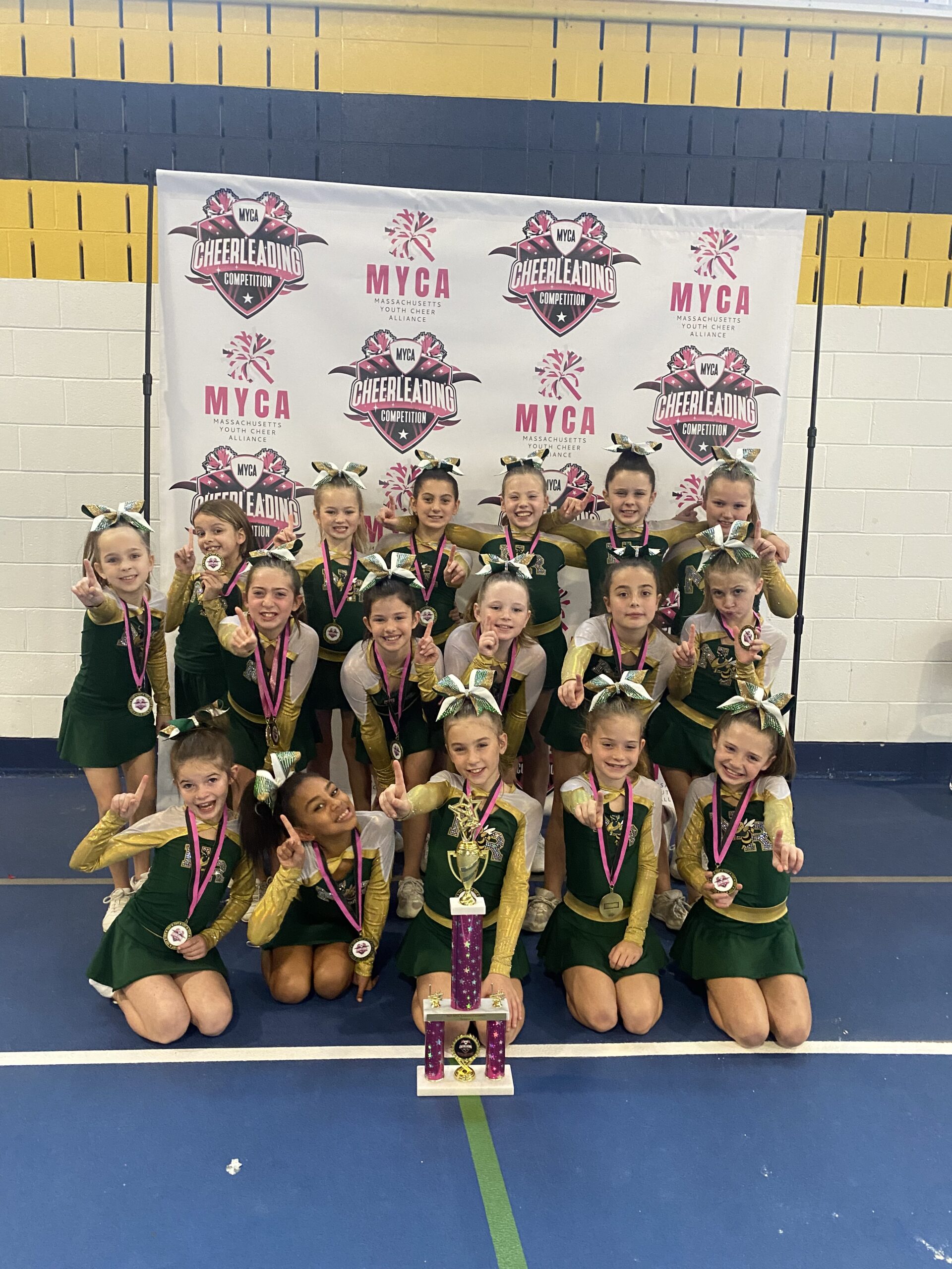 THE NORTH READING D TEAM cheerleaders just finished an undefeated season. These fourth-graders were both first place and grand champ which means they had the highest score of the entire competition, for both the Cheer for a Cure Competition in Topsfield and their MYCA League Competition in Andover.  They also placed first at the Andy Yosinoff invitational competitor held at the Reggie Lewis Center in Boston. The D Team cheerleaders are (front row, l-r): Natalie Lessard, Kendall Martin, Avery Carlson, Hayden Little and Paisley McKenna; (middle row, l-r): Layla Roy, Maya Biagiotti, Riley Doherty, Addie Howell, Emmy Keohan and Vivianne Dearborn; (back row, l-r): Joel Negron, Taylor Chamberland, Carmen Caruso, Eva Mendell, Ava Sucharewicz and Mya Perrotti. (Courtesy Photo)