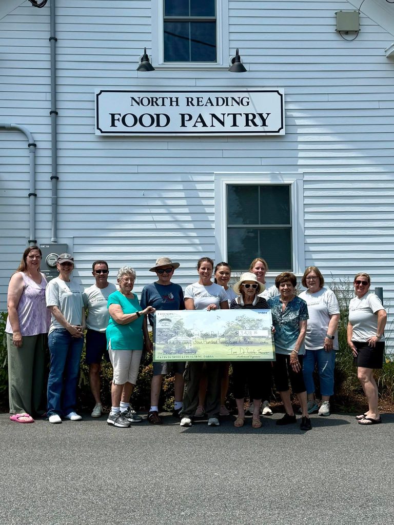 THE FRIENDS of the North Reading Council on Aging presented a check for $3,428.35 to the North Reading Food Pantry last week representing their share of this amazing community-wide Bingo fundraiser. The total amount raised was shared equally between the Friends and the Food Pantry. Presenting the check in the center foreground are: Friends of NRCOA Board members: Angela Mauceri, and Tom DeSwarte, Jen Pagliuca of the Food Pantry and Friends of NRCOA Board members Maureen Doucette and Joanna Lexth. In the rear (at far left) are: Kris Thomas Pickett of the Friends and Food Pantry volunteers Renee Bianchi and Ken Carpenter and (at far right) are: Food Pantry volunteers Betty Ton, Teresa Sanphy, Bonnie Wallace and Kate Schulz. (Courtesy Photo)