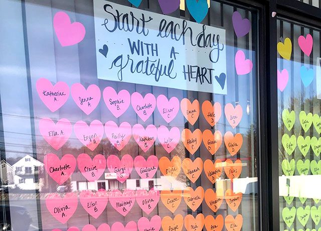 AS EAST COAST DANCE CENTER is unable to hold in-person classes during the COVID-19 shutdown, staff decorated the studio’s windows with a rainbow of hearts, one for each dancer’s name, along with some messages of hope during this uncertain time. (Courtesy Photo)