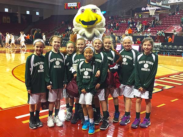THE FOURTH GRADE girls’ travel basketball team visited Boston College to celebrate National Girls and Women in Sports Day Jan. 21. After attending skills stations run by various varsity women’s teams, the girls sat court-side to watch the BC women’s basketball team take on Miami. The girls also enjoyed meeting BC mascot Baldwin the Eagle who mugged for the camera with (from left): Kiersten Higgins, Catherine Reddington, Naomi Barber, Mikaela O’Driscoll, Sara Suny, Addison Hajj, Makenzie Murphy, Mary Doble and Juliet Wasilewski. Missing from photo: Alison Lanciani. (Kristin Wasilewski Photo)