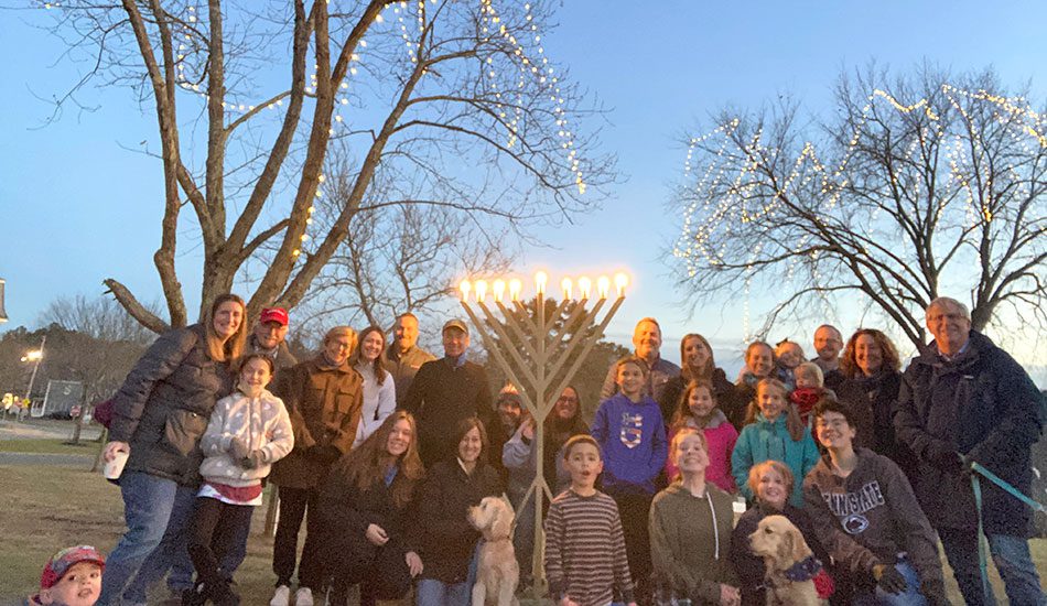 HANUKKAH was celebrated on the town common last Saturday by members of the newly formed Jewish Families of North Reading Facebook page. Meeting at sunset at the menorah, members of the Rogers, Brooks, Spetter, Packin, Kastner/Sharp, Davis and Davis/Wallner families were among those who gathered to share doughnuts and hot chocolate during the group’s first official “meet and greet.” (Courtesy Photo)