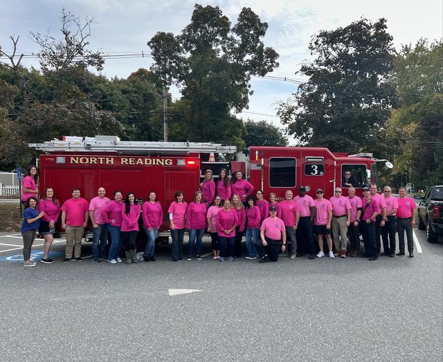 THE NORTH READING FIREFIGHTERS Local 1857 and Town Hall employees once again joined forces to raise funds for breast cancer research and treatment in recognition of Breast Cancer Awareness Month. Through the sale of specially designed pink NRFD t-shirts they were able to donate $3,000 to the Dana-Farber Cancer Center. (Courtesy Photo)
