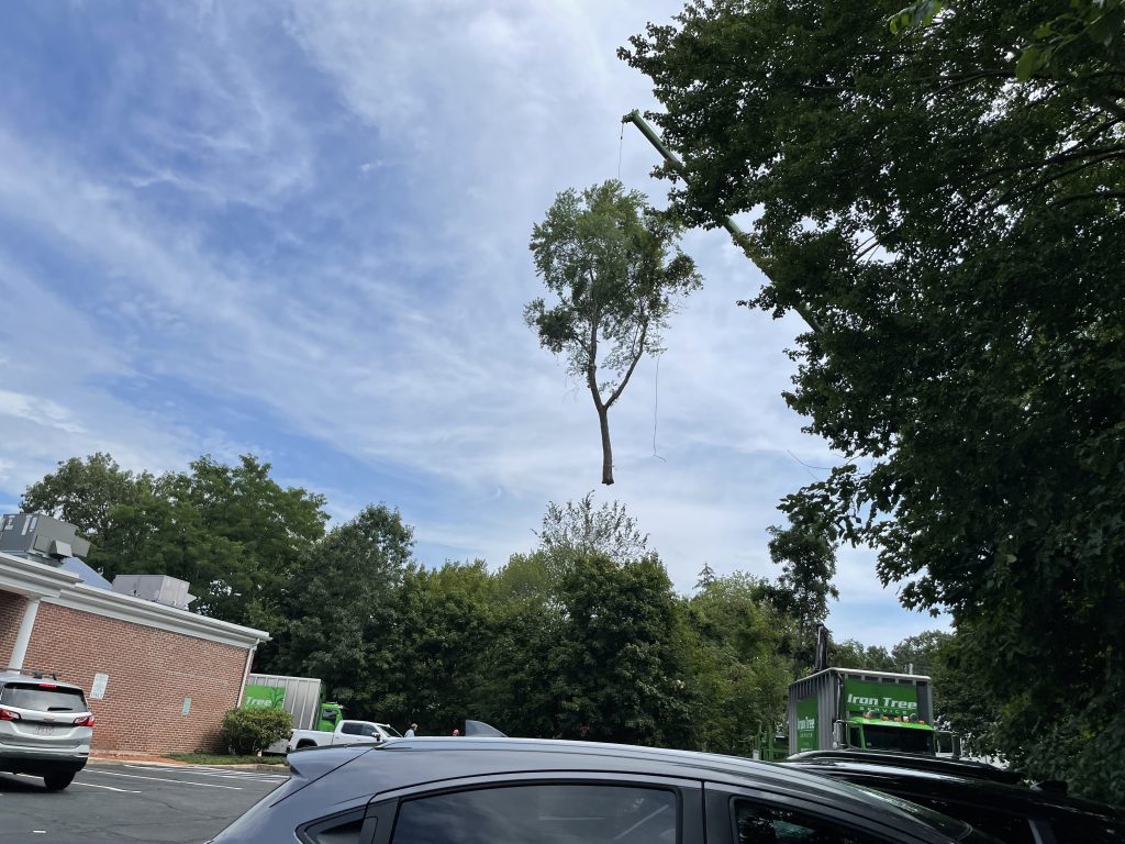 A CRANE plucked a large oak tree from the middle of the wooded section of Ryer’s Country Store property Thursday afternoon, as viewed from the adjacent bank parking lot. It was one of several trees removed as the renovation project on the original Ryer’s building nears completion. (Maureen Doherty Photo)