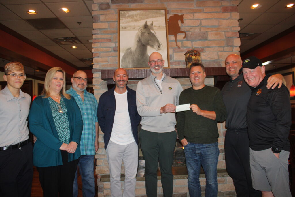 THE HORSESHOE GRILLE recently presented a $40,000 check to the Dana-Farber Cancer Institute’s Jimmy Fund. The proceeds were raised at the Horseshoe’s 39th annual Jimmy Fund Golf Tournament and given in memory of Donna Anderson, a longtime Horseshoe Grille employee who volunteered at the tournament for years. From left: Donna’s grandson Jack Anderson, daughter-in-law and son, Erin and Dirk Anderson; Horseshoe owner Noah Goldstein; Jimmy Fund Associate Director of Golf Programs Will Grogan; Horseshoe owners Ryan Cox and Brad Atkinson; and Pat Lee, former owner and Golf Tournament founder. (Maureen Doherty Photo)