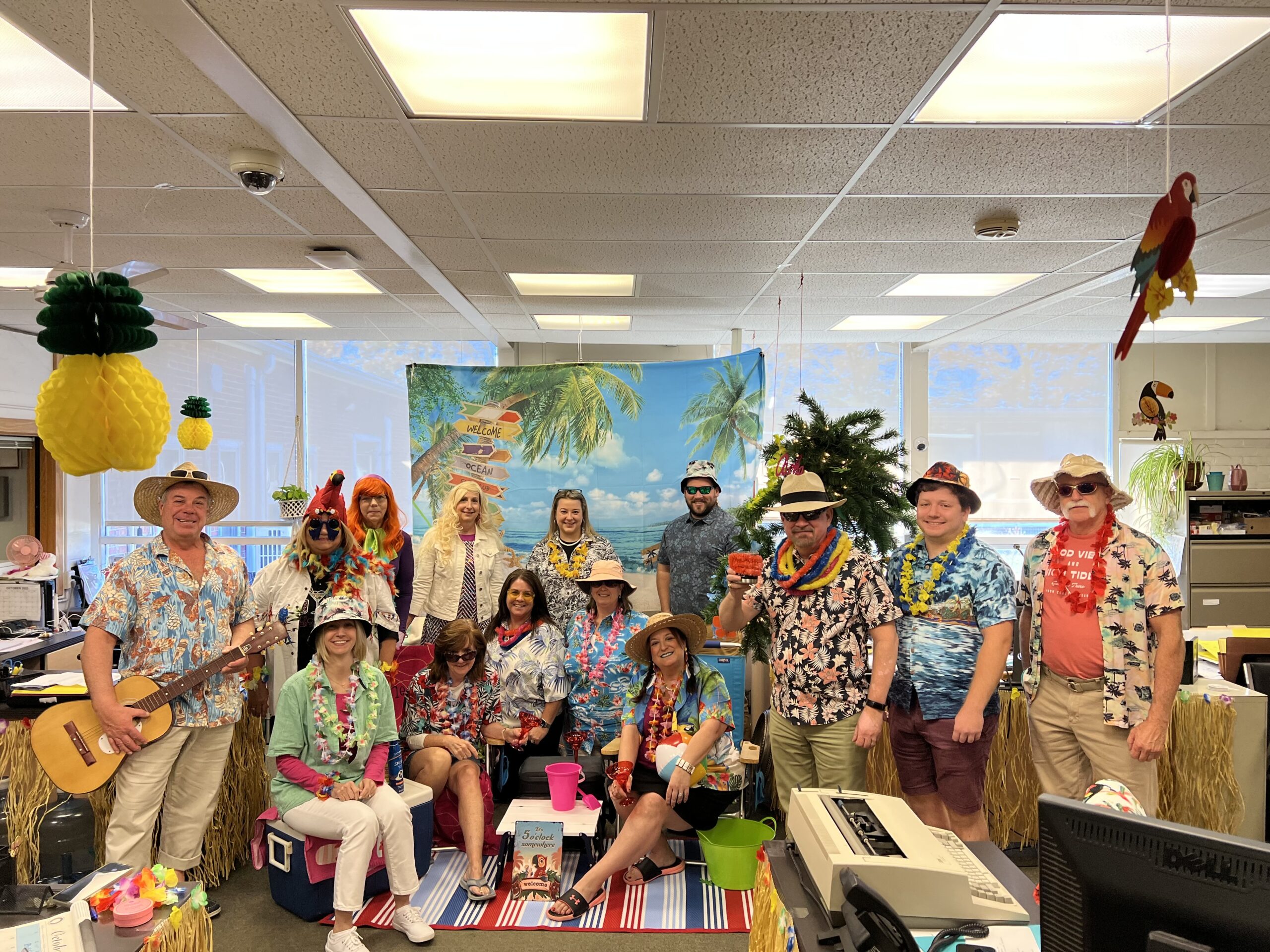A MARGARITAVILLE tribute to the late, great singer-songwriter Jimmy Buffett, purveyor of the “island escapism” lifestyle and light-hearted tropical rock music was the theme created by members of the Building, Zoning, DPW, Planning, Conservation and Human Resources departments at Town Hall for Halloween. The tribute lived up to Buffett’s last words to his sister Lucy: “Have fun!” (Jen McNeil Photo)