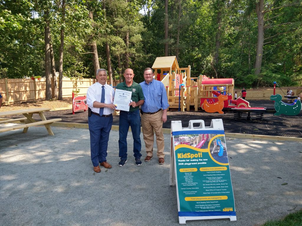 PARKS DIRECTOR Marty Tilton (center) was presented with a citation from the State Senate recognizing the rejuvenated and accessible KidSpot playground and its positive impact for the community from Sen. Bruce Tarr (L) and Rep. Brad Jones (R). State grants of $150,000 contributed to the playground renovation which was rededicated June 12. Tilton also thanked the many people who contributed their time and raised funds to support the renovation. (Lil Hartman Photo)