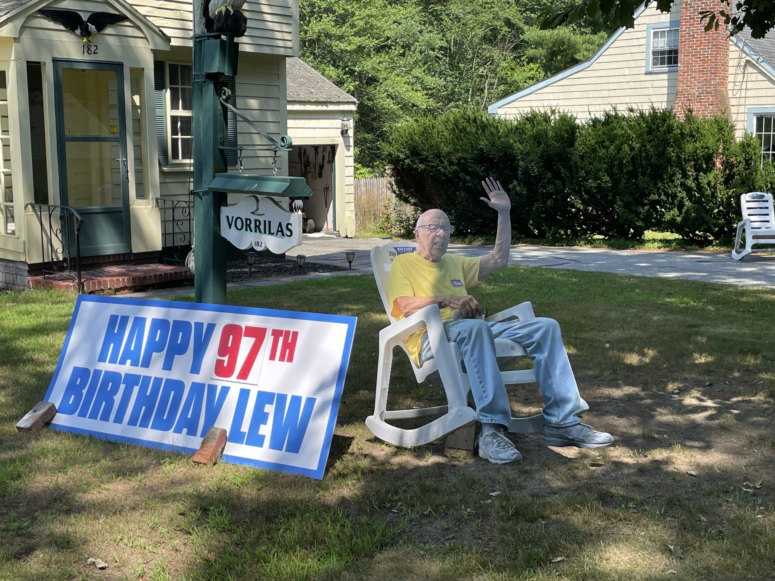HAPPY BIRTHDAY! Longtime North Reading resident Lew Vorrilas recently celebrated his 97th birthday. Many people in town knew Lew as the proprietor of Lew’s Mobil at the corner of Park and Haverhill streets for decades. Those passing by his Haverhill Street home may have even see him relaxing in his rocking lawn chair waving to old and new friends! For those extra hot days this summer Lew’s family got creative with this 3D body double. (Maureen Doherty Photo)