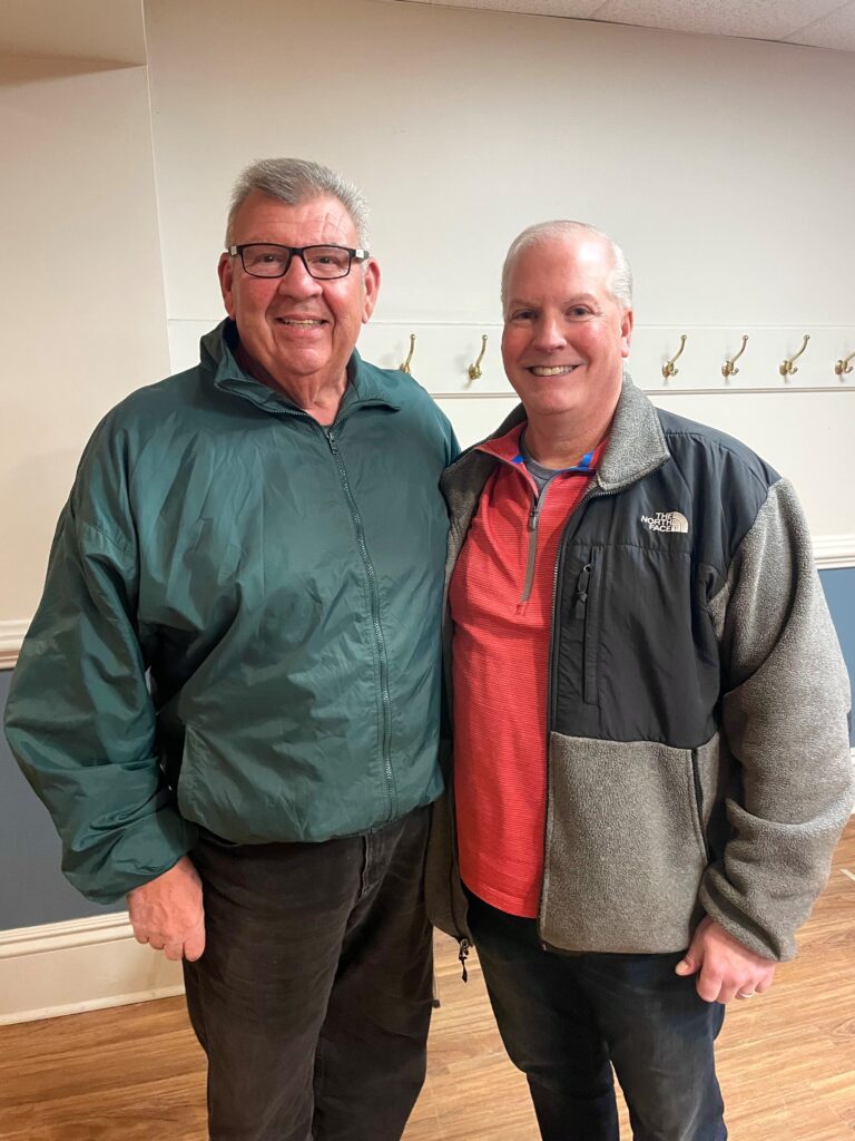 PATRIOTS.COM EDITOR Paul Perillo (right) entertained a full house at the library recently, regaling the crowd with stories of 20+ years of covering the Patriots, including all six Patriots Super Bowl championships. Among the guests in the crowd was local resident Paul Lucci Sr. who also happened to be one of Perillo’s football coaches at Everett High School. (Emily Klesaris Photo)