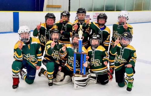 AFTER FINISHING the regular season in second place with a 17-6-5 record, the North Reading Squirt Green team went on to three weeks of playoff games recently. With  hard work from the entire team, they won in the quarterfinals, 10-0 in a shutout over Winchester. In the semifinals the team beat Melrose 5-2 bringing them to the East American Division Championship game. On March 30, North Reading took the American East “AA” Division Championship title in a nail-biting overtime 3-2 win over Reading. Then in the Squirt East “AA” American vs National game on March 31, North Reading was crowned the Squirt East “AA” Champions with an outstanding 3-1 win over Hyde Park. Congratulations to the North Reading Green Squirt team on an amazing season filled with great team work by all players! Pictured in the front row, from left are Charlie Scott, Cadence Crowley, Dylan O’Driscoll, Brendan Gazda and Danny Rego. In the back row, from left are Charlie Considine, Anthony Giordano, Jack Harty, James Nelson and Gavin Griffith. Missing from photo: Jack Lazure. (Courtesy Photo)