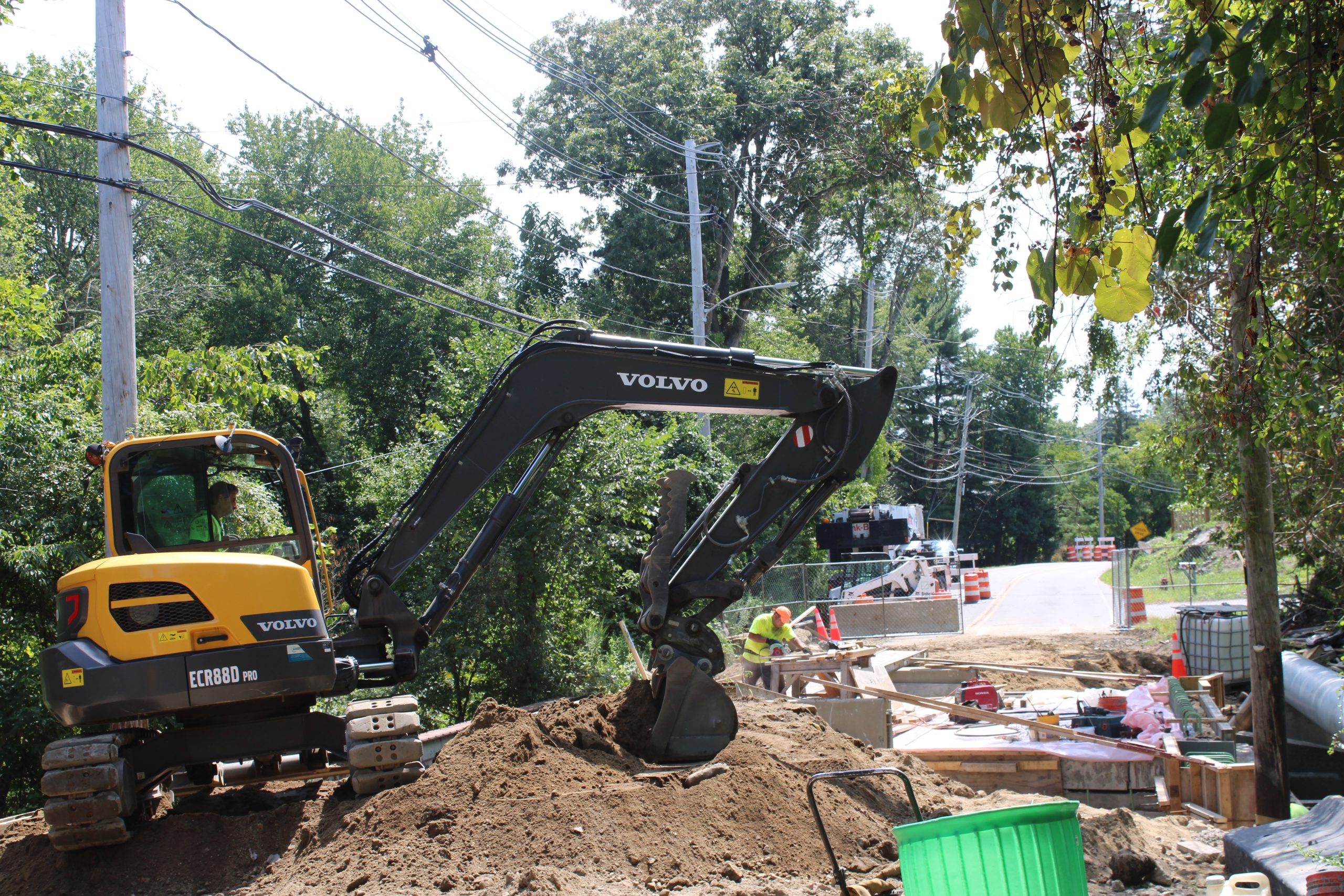 STEADY PROGRESS was being made reconstructing the Park Street Bridge, which spans Martins Brook near the Masonic Lodge, last Thursday afternoon. Last month, the town was awarded a $500,000 MassDOT grant under the Municipal Small Bridge Program created in 2016 specifically to help cities and towns rehabilitate or replace bridges on public ways with spans of 10–20 feet because federal law does not recognize structures with spans of less than 20 feet as bridges. In 2022, the town also received a $100,000 grant to design the bridge. Both awards were the maximum allowed. (Maureen Doherty Photo)
