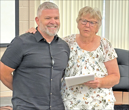 OUTGOING Director of Veterans’ Services TJ Tedeschi (USMC ret.) is offered a toast by Rita Mullin during his goodbye party at Town Hall Aug. 5. An announcement of his successor is anticipated to be made soon based on search committee recommendations and final interviews. (Catherine McGloughlin Photo)