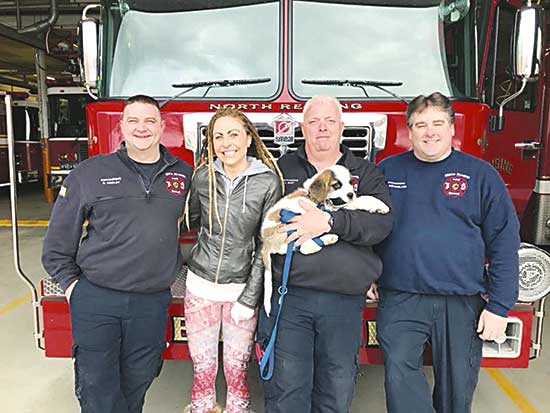 BODHI, the 9-week-old Saint Bernard puppy now fully recovered from his harrowing choking experience last week, and his grateful owner, Megan Vitale, visited some of the first responders who helped to save his life. From left: firefighter CJ Hadley, Megan Vitale, FF Jon Burt holding Bodhi and FF Herbie Batchelder. Video images of the NRPD surveillance footage of Bodhi’s resuscitation by police and fire personnel went viral, with over 66M views on one of the sites. (Courtesy Photo)