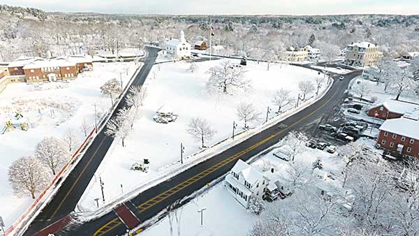 THE TOWN COMMON and Historic District, North Reading’s Motif No. 1, was captured by drone perfectly by photographer Al Pereira. Clockwise from left: Batchelder School, Third Meetinghouse, Rev. Putnam House and Barn, Damon Tavern, Flint Memorial Library, Jared McLane House and the Police/Fire Station. (Al Pereira/Advanced Photo)