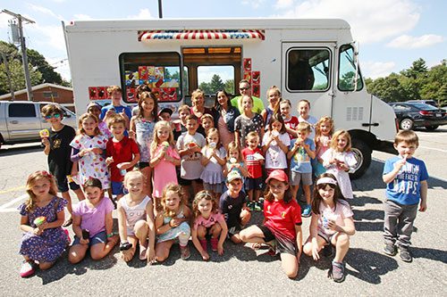 THREE DOZEN youngsters greeted the ice cream truck at the Little School Tuesday afternoon. They were thrilled to choose a free frozen treat to celebrate the last day of summer vacation, compliments of Farrelly Realty Group and Salon 77. Using two trucks, visits were made to each school and Ipswich River Park to spread summer cheer! (Al Pereira/Advanced Photo)