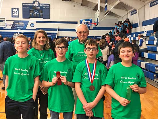 SCIENCE OLYMPIAD team members representing NRMS had plenty to celebrate after winning multiple awards in the State Tournament, including an 11th place overall finish. From row, from left: Aidan Seaman, Ivan Deiko, Ryan Ciulla and Eli Hunt; back row, Head Coach Laura Bowers and Assistant Coach Cliff Bowers. Missing from photo was team member Dylan Folscroft. (Courtesy Photo)