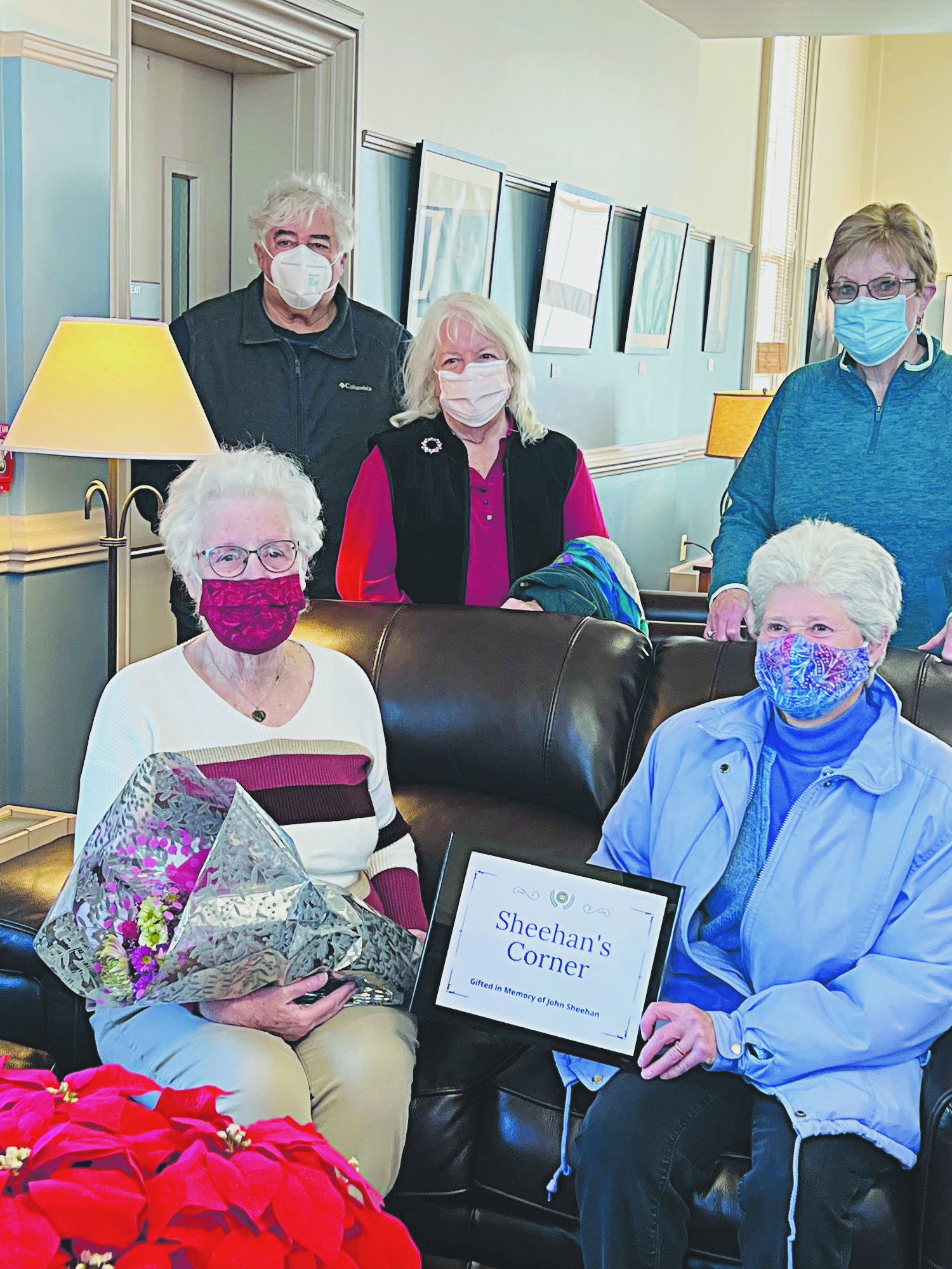 FLINT MEMORIAL LIBRARY has dedicated a comfortable and cozy reading nook gifted in loving memory of longtime North Reading resident John J. Sheehan. The late husband of former Trustee and Friend of the Library Lorraine Sheehan (seated at left), the Friends of the Library completed the corner by contributing a second loveseat and ottoman. It is hoped patrons will enjoy reading the morning paper or a good book in this first floor nook for years to come. Also on hand for the dedication were Jean Osborn (seated, right) and (standing, l-r): Art Grossman, Adrienne Callahan and Karen Vitale. (Courtesy Photo)