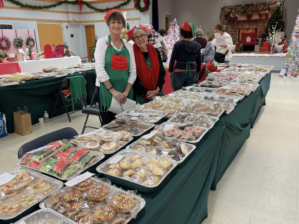 WORKING their elfin magic at the Cookie Walk table, where row upon row of delectable treats awaited attendees of St. Theresa’s Christmas Spectacular are volunteers Susan Devlin (left) and Fran Annand. (Courtesy Photo)