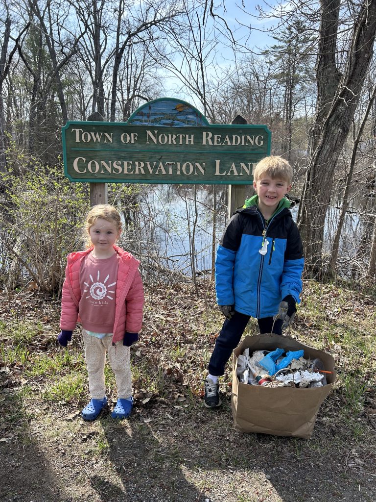 IN HONOR of Earth Day, trash was removed from a section of North Reading Conservation land thanks to the efforts of Ellie Chase, 4, and her big brother Max, 7. (Courtesy Photo)