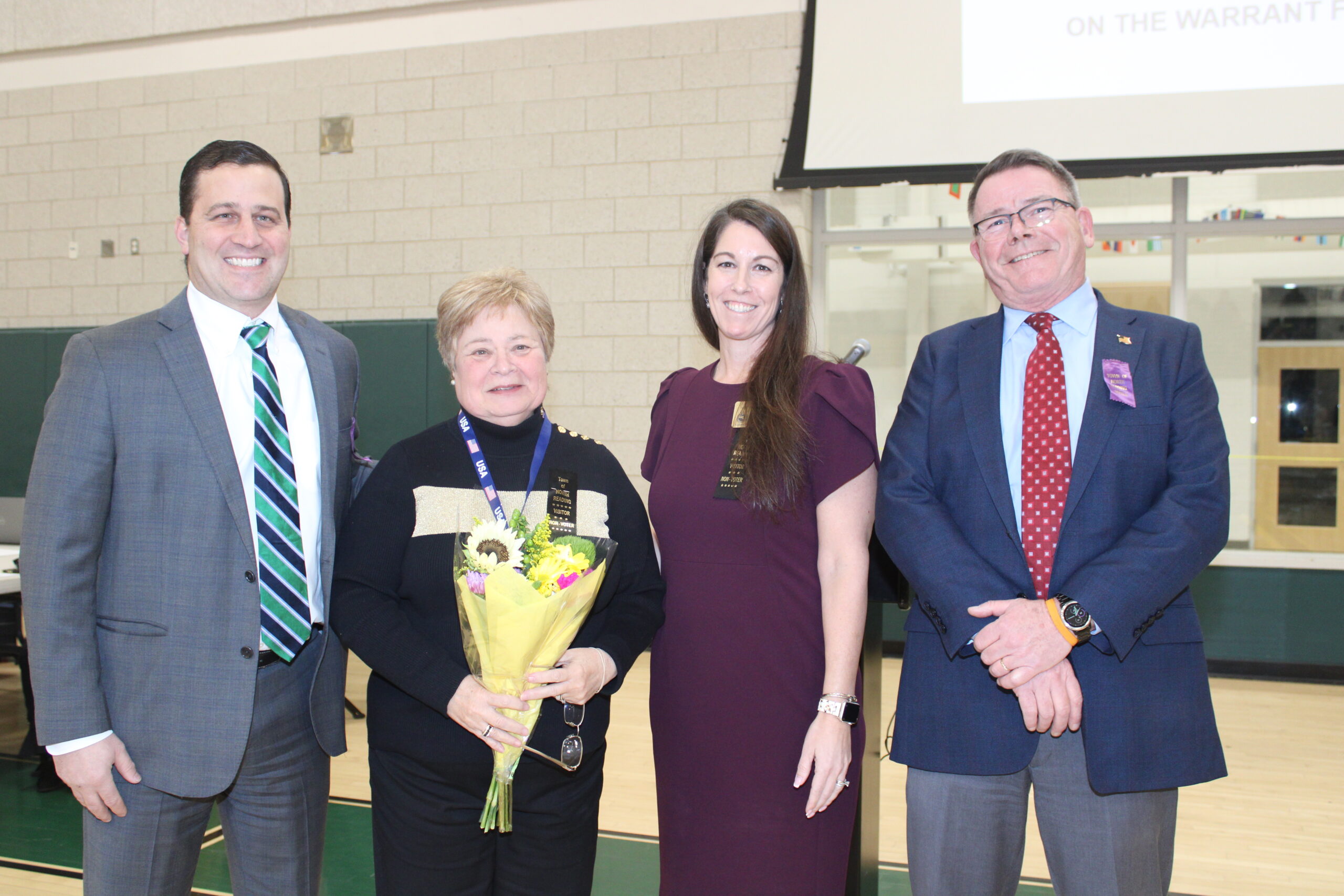 CAROL DUCROW was thanked for her 24 1/2 years of service as a secretary in the Town Clerk’s office on the eve of her retirement at Tuesday’s Special Town Meeting. From left: Town Administrator Mike Gilleberto, Carol Ducrow, Assistant Town Clerk Stephanie Connolly and Town Moderator John Murphy. (Maureen Doherty Photo)
