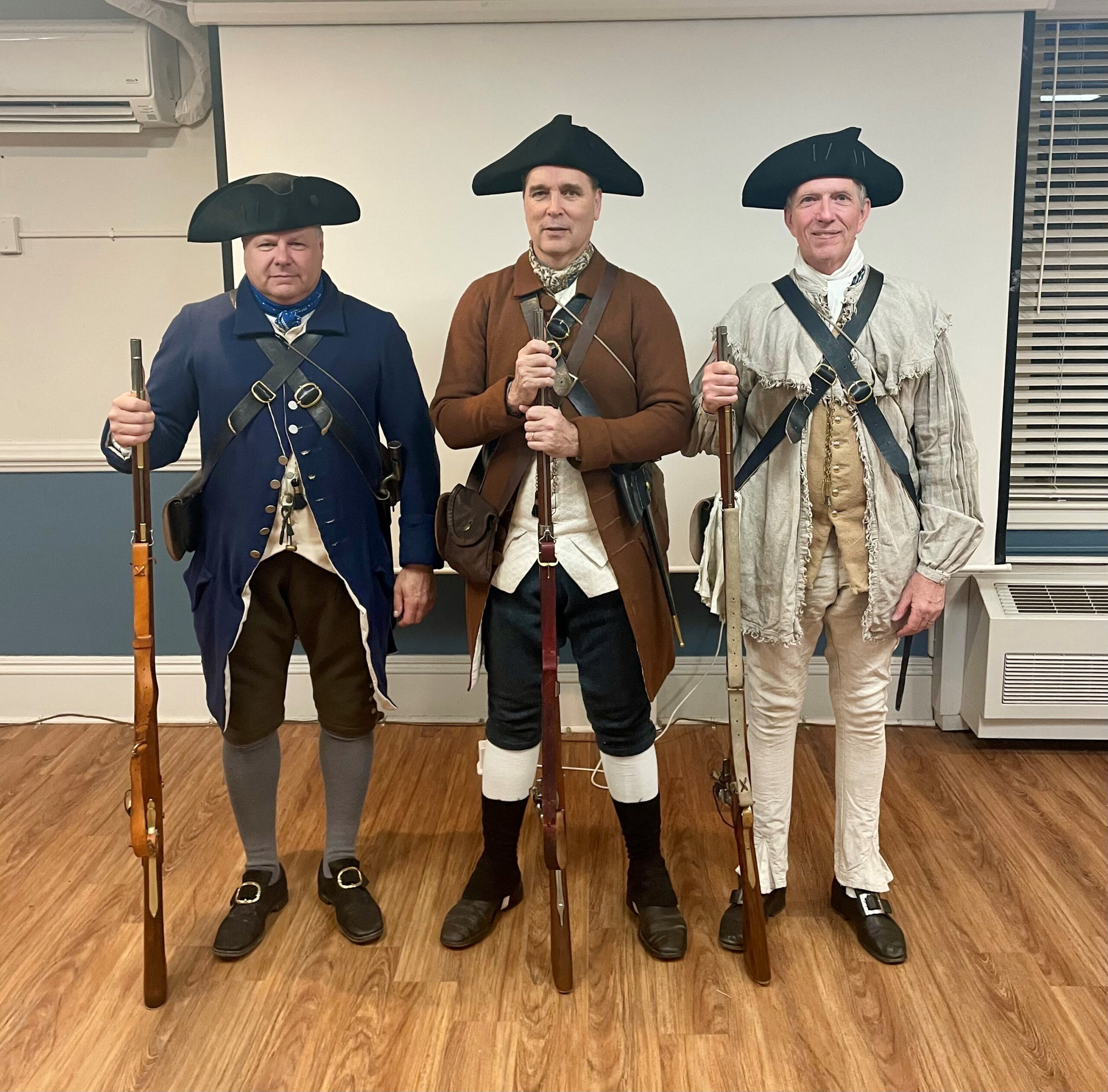 THE LEXINGTON MINUTE MEN came to town April 25 in full colonial impression (traditional 18th century dress) to tell the stories of the patriots who fought at the battle of Lexington and Concord on April 19, 1775, signaling the start of the Revolutionary War. A large and appreciative audience attended the event at the library. From left: John Klesaris who portrays Nathaniel Wyman; 2nd Lt. Adjutant Dan Gipson who portrays Samuel Hadley; and Doug McLeod who portrays Isaac Muzzy. (Emily Klesaris Photo)