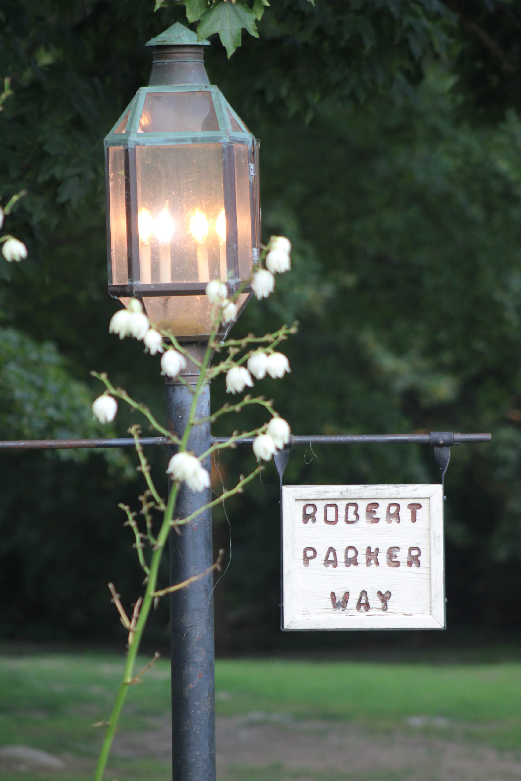 ROBERT PARKER WAY, a path on the grounds of the Rev. Daniel Putnam House, is illuminated by an old fashioned street lamp and framed by flowers on a calm summer evening. (Maureen Doherty Photo)