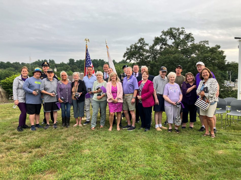 PURPLE HEART recipients and family members stand with Gold Star families, veterans and local and state officials at the conclusion of the North Reading Purple Heart Ceremony on the Town Common August 7. North Reading VFW Post 10874 donated challenge coins for Purple Heart recipients and Purple Heart and Gold Star families (Courtesy Photo)