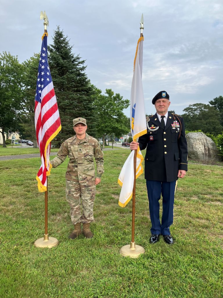 PRESENTATION of the Colors to open the town’s Purple Heart Day ceremony was performed by SPC4 Katelynn Weaver, U.S. Army, retired (left) and MSGT Timothy Corcoran, U.S. Army, retired. The Bandstand on the common will remain lit in purple lights throughout August to honor Purple Heart recipients. (Courtesy Photo)