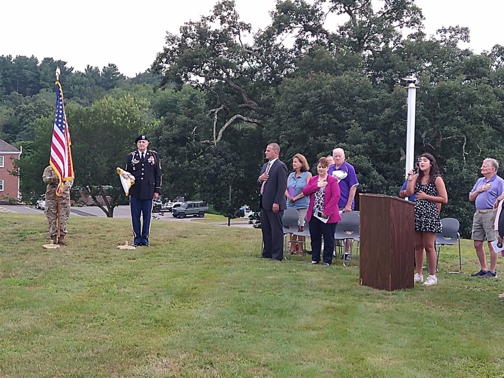 NRHS STUDENT Alivia Rowe (at podium) sang the National Anthem at the start of the town’s Purple Heart Recognition Day Ceremony on the Town Common August 7. (Courtesy Photo)
