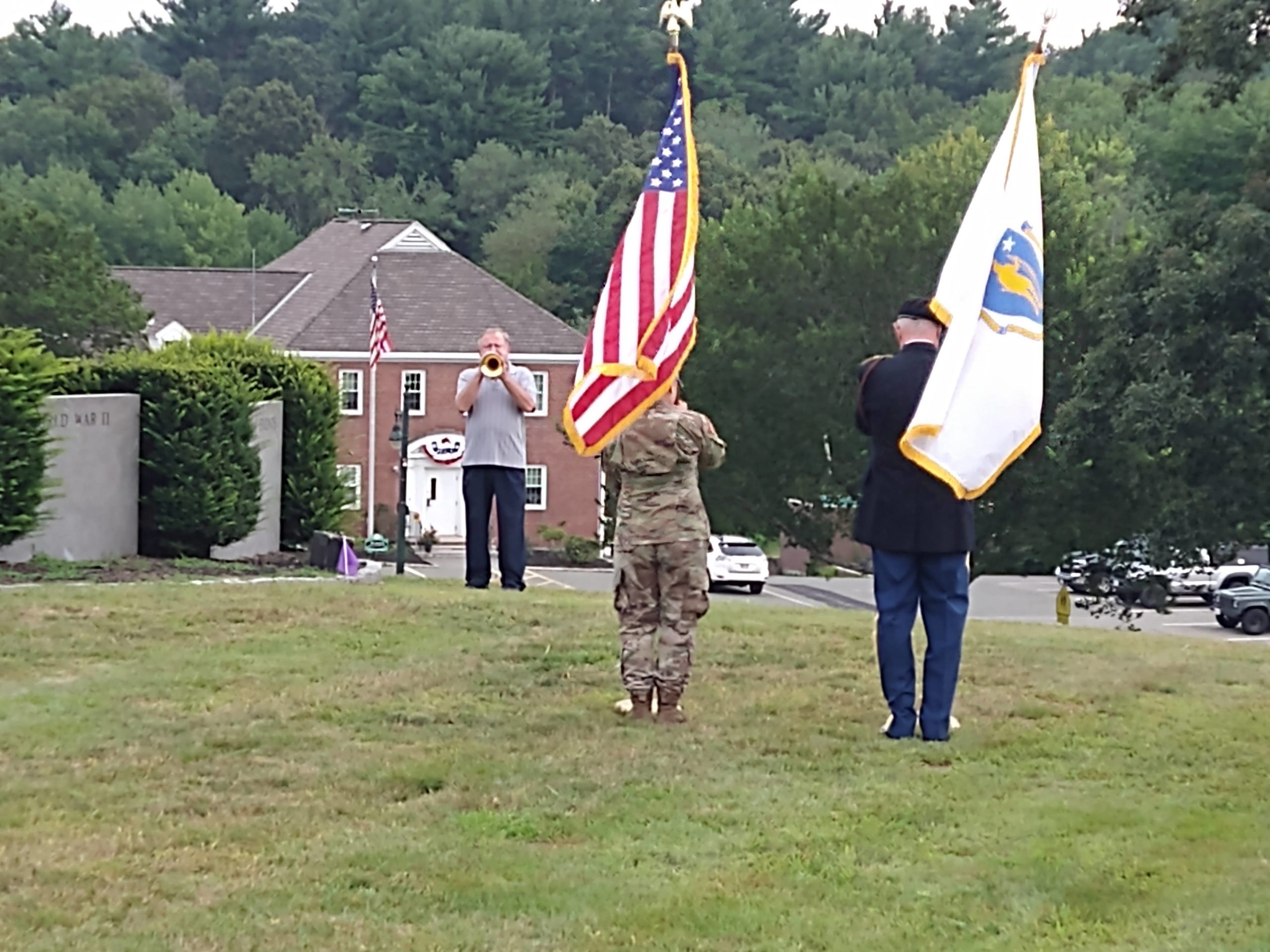 LOCAL BUGLER Hugo Wiberg III performs Taps while SPC4 Katelynn Weaver, U.S. Army (retired) and MSGT Timothy Corcoran, U.S. Army (retired) present the colors. North Reading VFW Post 10874 donated a new Purple Heart flag that was raised on the town flag pole during the ceremony. (Courtesy Photo)
