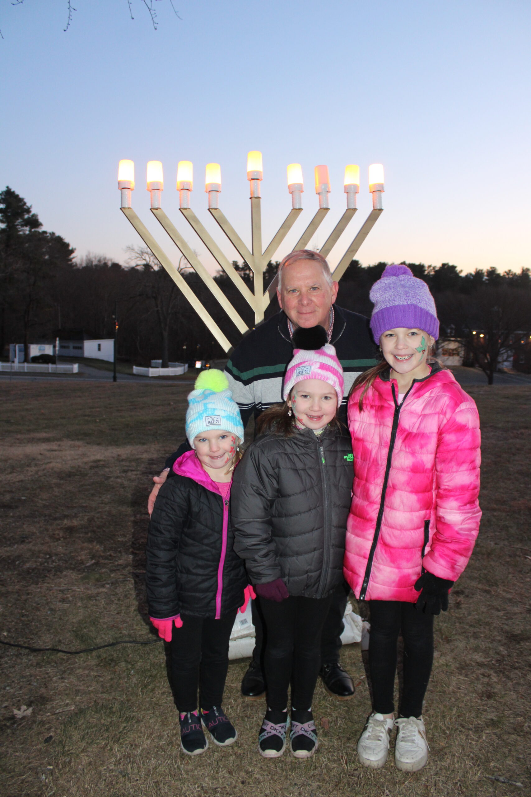 A HANUKKAH menorah was lit as part of the Tree Lighting festivities on the common. It will be lit for eight days after sundown beginning on Dec. 25 this year. RNR Chamber Executive Director Rob Miner admired it along with the Ross sisters, Emma, 4, Hannah, 6 1/2, and Amelia, 9.