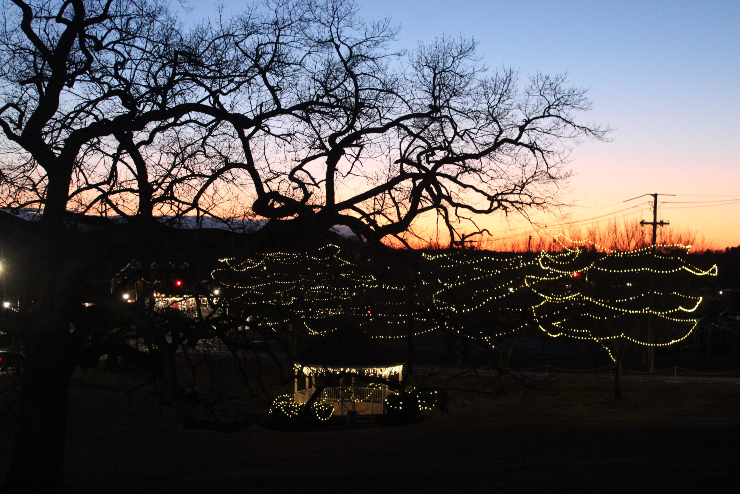 SUNDAY’S BEAUTIFUL sunset on the Town Common was enhanced by twinkling lights adorning the trees and the bandstand.