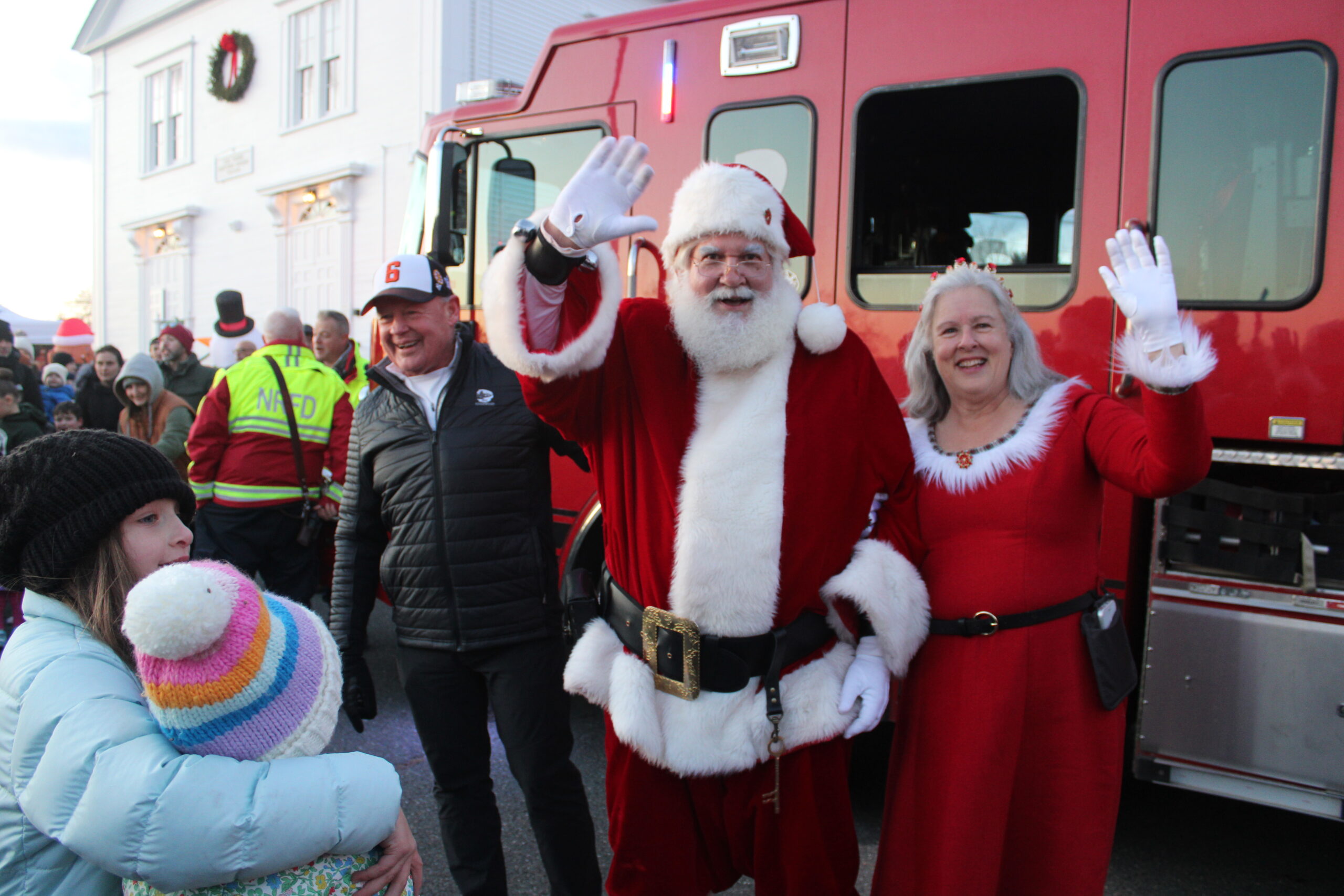 ARRIVING IN STYLE aboard the Fire Department’s Engine 2 were Santa and Mrs. Claus and the children were eager to greet them.