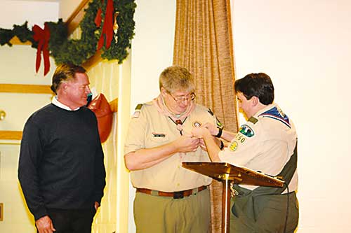MENTOR PINS are presented to Kevin Spicer (left) and Tony O’Brien by Eagle Scout Tom Lasdin.(Photo by Maureen Doherty)