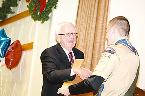 A full house of family, friends and dignitaries attended the ceremony and catered dinner held at St. Theresa Parish Hall Jan. 6 to honor Eagle Scouts Joseph Gonthier, Connor Gover, Thomas Lasdin and Scott Valenti. The parish serves as the chartering organization for Troop 750, a role it assumed last year after 50 years of sponsorship by the Knights of Columbus. During the ceremony, a show of appreciation was offered to Don Henchey, a member of the K of C who oversaw Troop 750 for 35 of those 50 years.