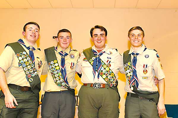 SOAR LIKE an Eagle. The town’s four newest Eagle Scouts, from left, Joseph Gonthier, Connor Gover, Thomas Lasdin and Scott Valenti, were honored during a special quadruple Eagle Court of Honor hosted by Boy Scout Troop 750 and their families Jan. 6. (Maureen Doherty Photo)