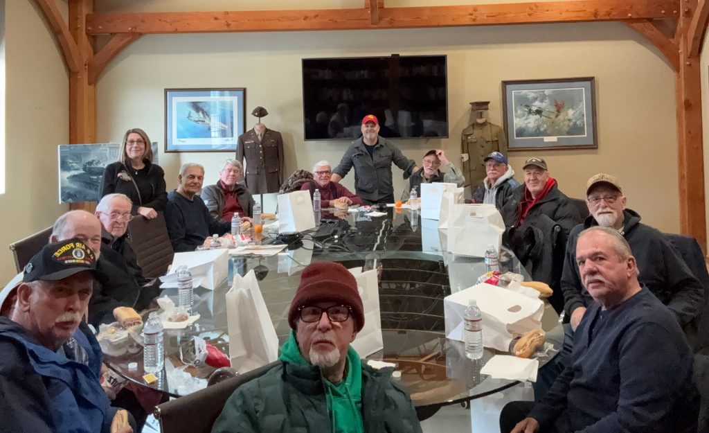 LOCAL VETERANS enjoy their lunch in the executive suite of the American Heritage Museum prior to their tour of one of the world’s largest collections of tanks and military vehicles. They are (clockwise from bottom) John McKinnon (maroon hat), Paul Fillmore, Paul Sanger, Al Heard, Veterans Services Administrative Assistant Catherine McGloughlin, Joe Maccarow, Steven Schuyler, Rich Giordano, VSO TJ Tedeschi, Bill Pilote, Gary Trenrsch, Tom Calvani, Paul Denaro and Gerry Pelletier. (Courtesy Photo)