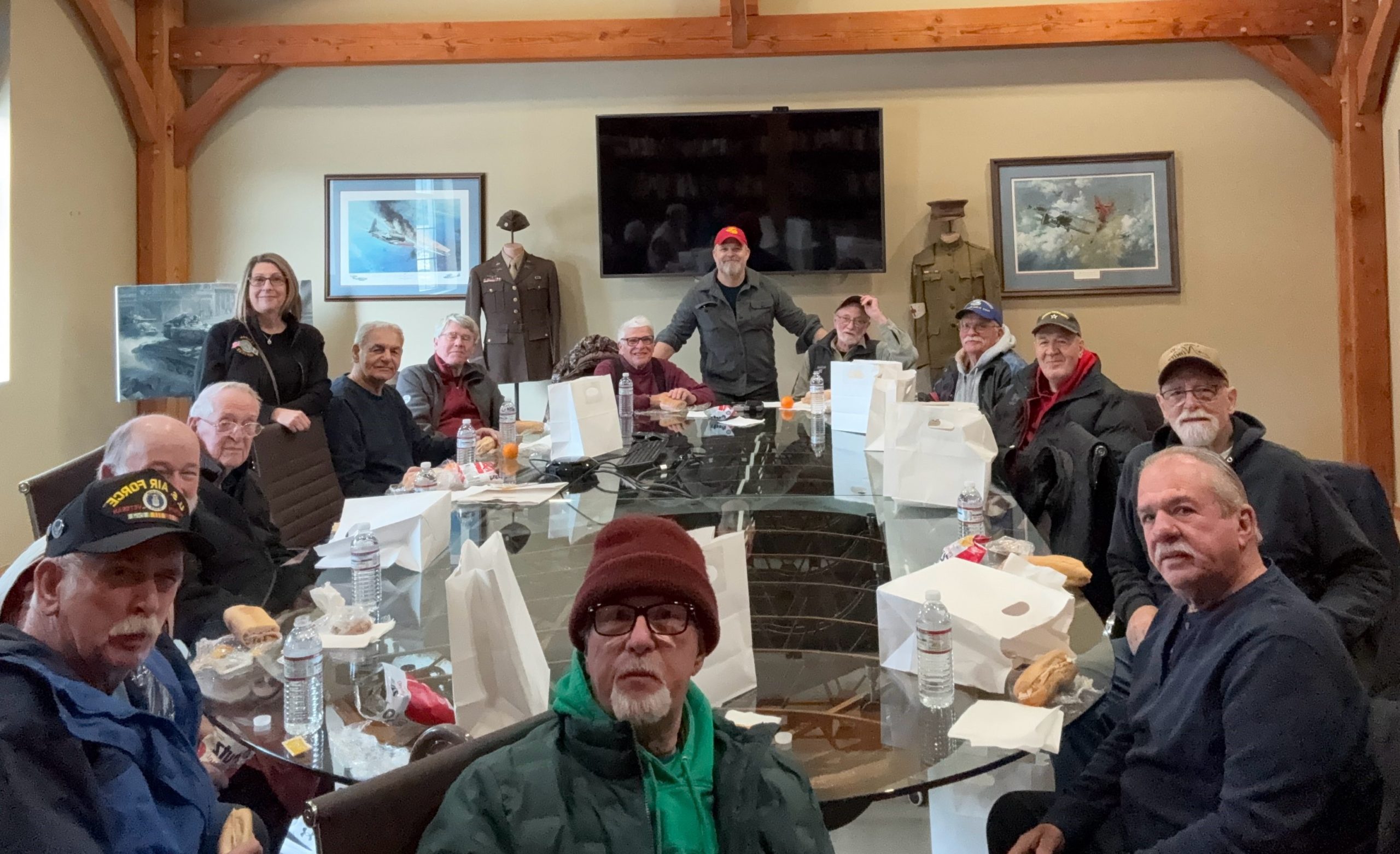 LOCAL VETERANS enjoy their lunch in the executive suite of the American Heritage Museum prior to their tour of one of the world’s largest collections of tanks and military vehicles. They are (clockwise from bottom) John McKinnon (maroon hat), Paul Fillmore, Paul Sanger, Al Heard, Veterans Services Administrative Assistant Catherine McGloughlin, Joe Maccarow, Steven Schuyler, Rich Giordano, VSO TJ Tedeschi, Bill Pilote, Gary Trenrsch, Tom Calvani, Paul Denaro and Gerry Pelletier. (Courtesy Photo)