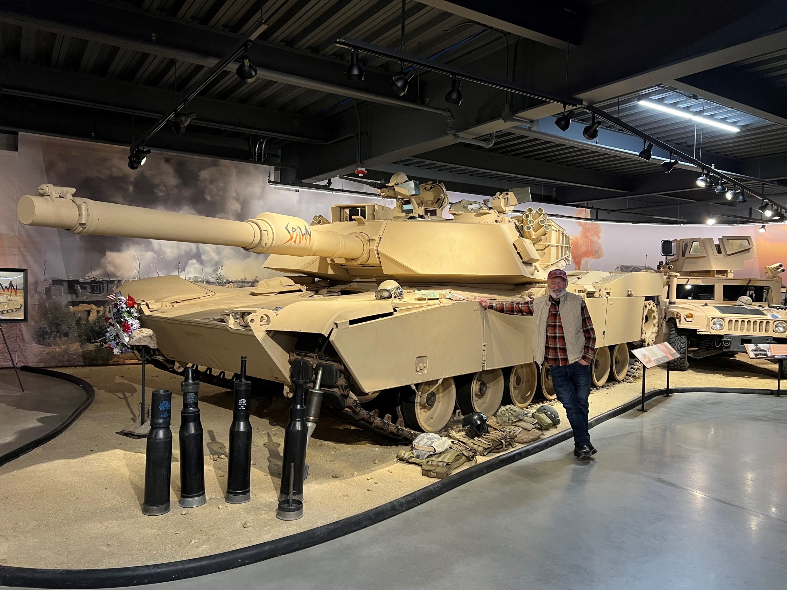 LEAN ON ME. North Reading veteran Paul Sanger views a tank and munitions at the American Heritage Museum in Stow which features the Jacques M. Littlefield Collection in a 66,000 square foot exhibit space designed to explore, study and remember the human impact of America’s fight to preserve freedom. (Courtesy Photo)