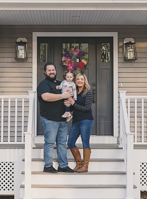 A SNAPSHOT IN TIME was captured by local photographer Samantha Watson of dozens of North Reading families simply gathered on the front steps of their homes last weekend, such as this photo of Chris and Renee Deming and their daughter Meredith. Taken with a telephoto lens to maintain proper social distancing, Watson’s only “fee” was a pledge by each family to make a donation to the North Reading Food Pantry’s gofundme page. The photos have been posted to social media. (Samantha Watson Photography)