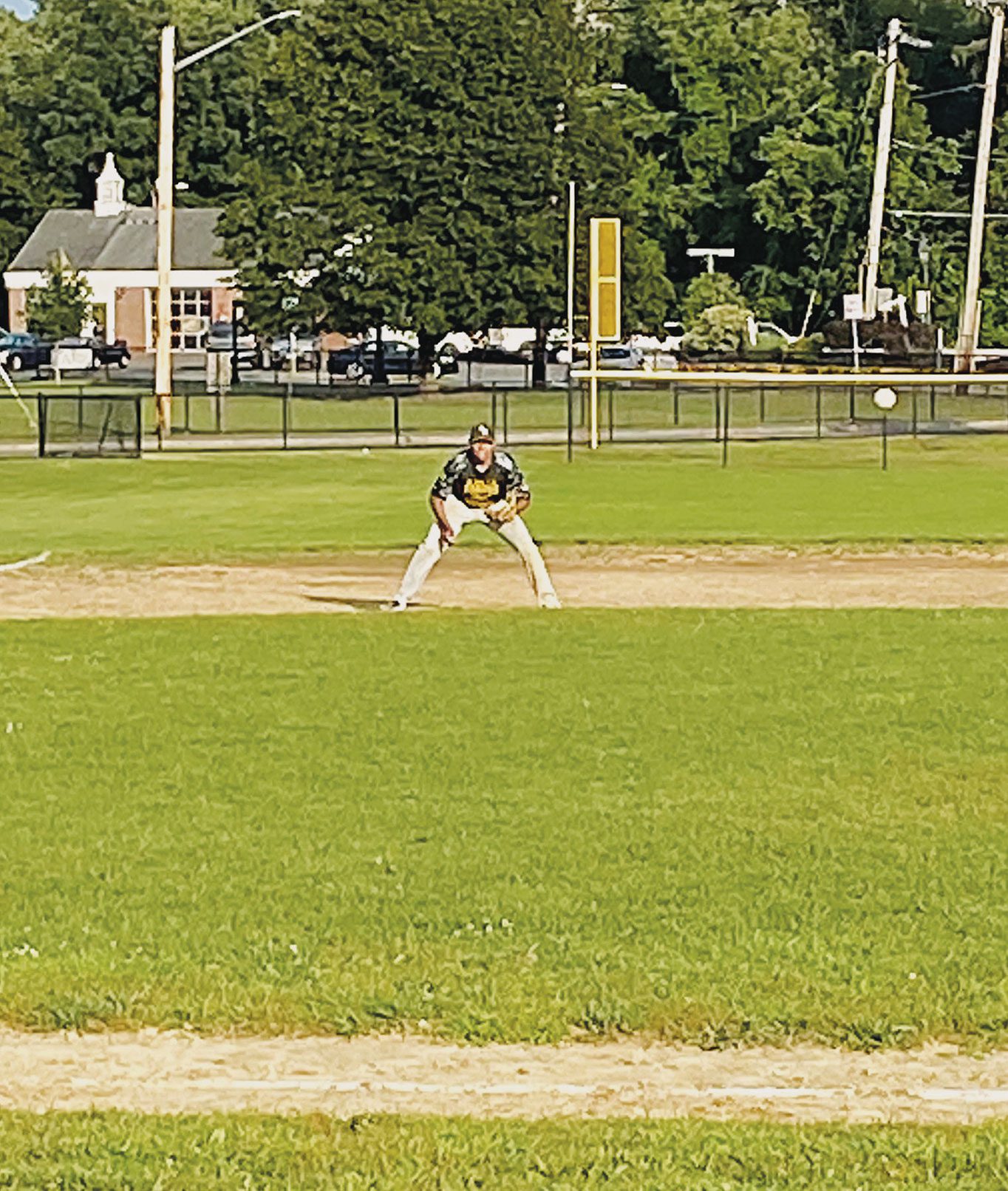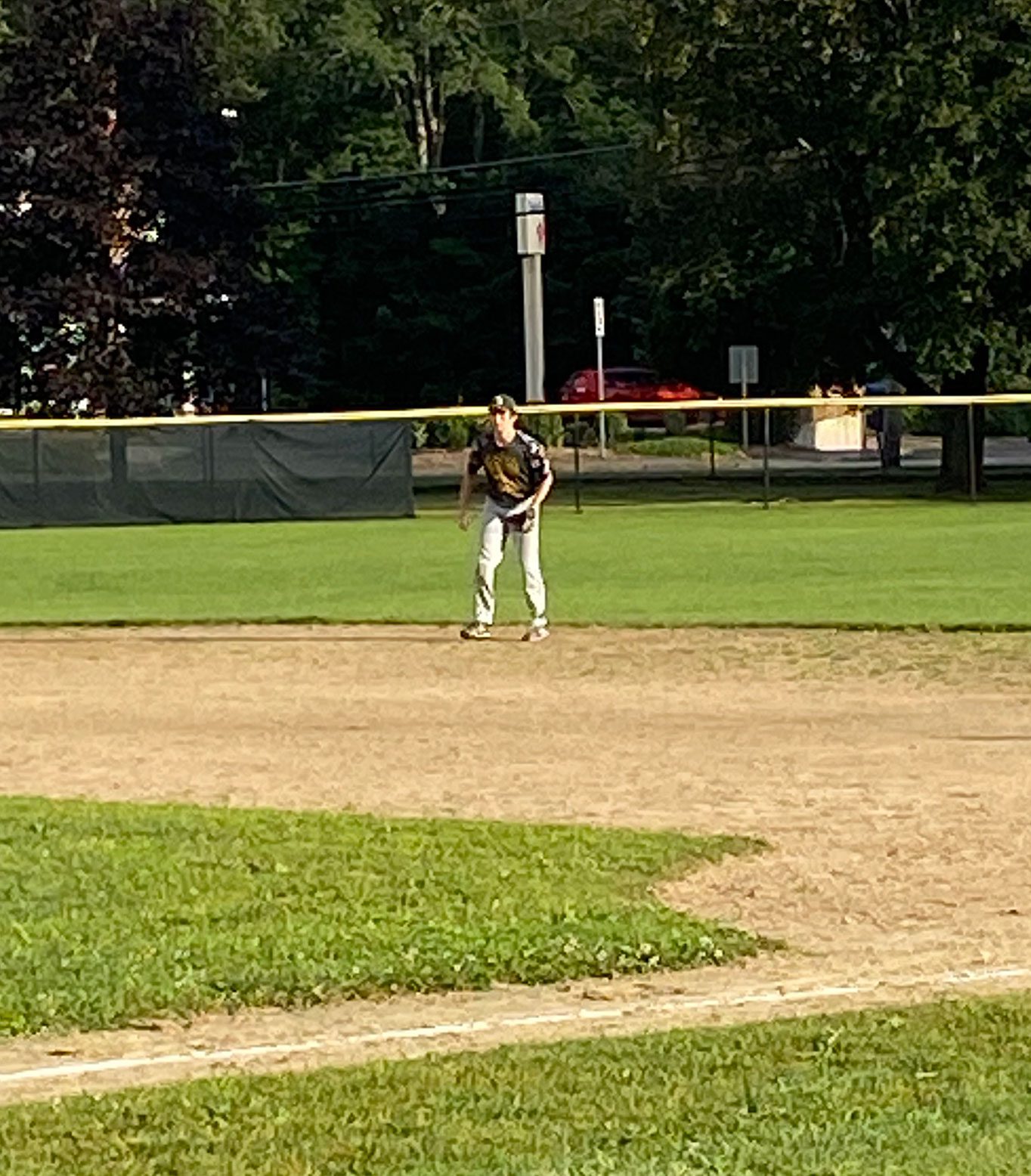 TIM MCCARTHY follows through on a pitch against Dracut on Aug. 3 as Aldo Vittozzi gets ready at shortstop and Zach Rosatone readies in left. McCarthy pitched a complete game shutout. (Courtesy Photo)