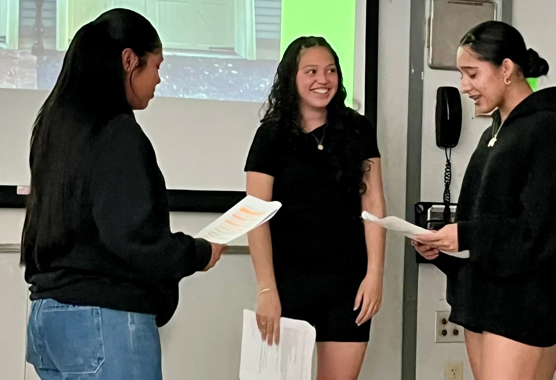 FROM LEFT, Northeast Metro Tech students Ashley Gutierrez Calix, Giselle Benitez Valdevieso and Amanda Rocha, perform a scene from “To The Top of Greenfield Street,” a played based on the book by the same name. Northeast Metro Tech Teacher Ryan Standley wrote the book that students translated into a play that they then performed. (Photo Courtesy Northeast Metro Tech)