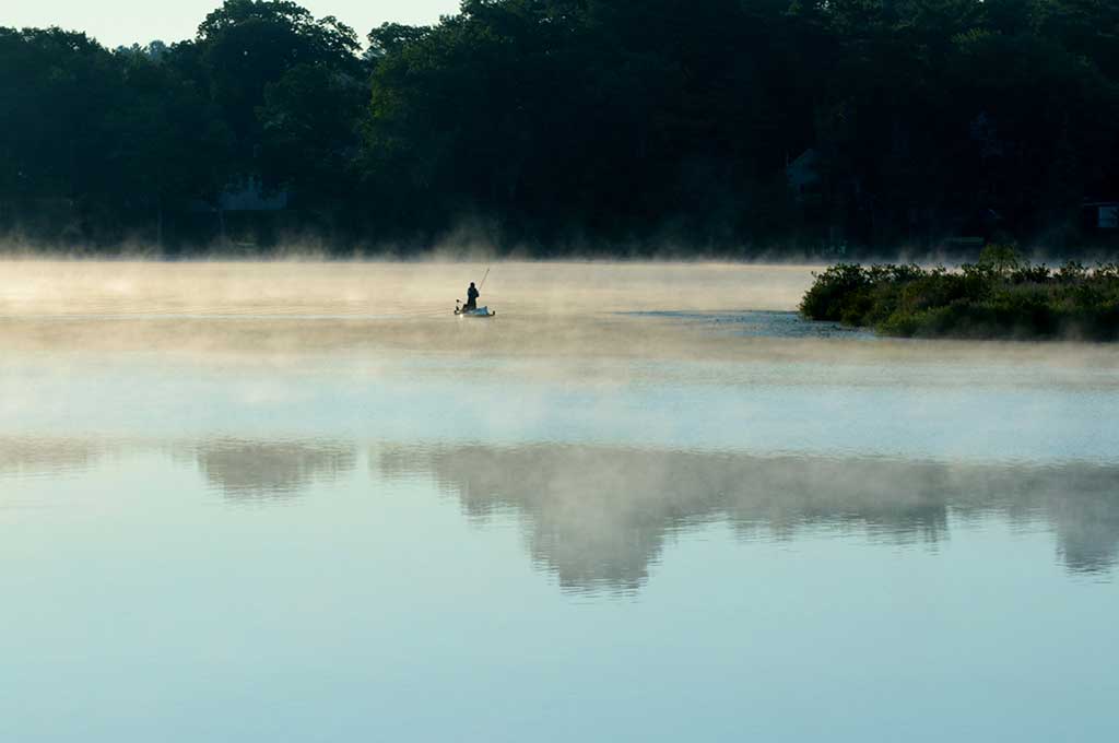 A lone fisherman just off Turtle Island enjoys the solitude as the early morning mist rises on Martins Pond. (Lori Lynes Photo)